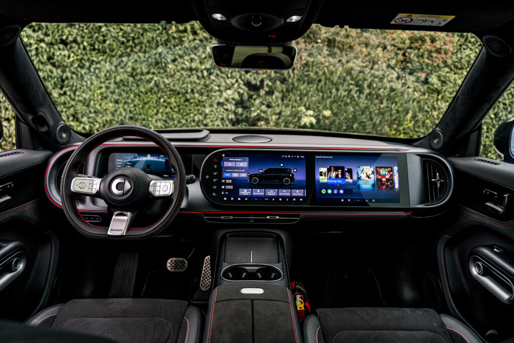 Inside, the cabin confirms this more premium orientation. The Brabus atmosphere is defined by a few clear visual cues: specific upholstery, contrasting stitching, red seat belts, and an Alcantara-trimmed steering wheel. Build quality is convincing, with a serious presentation and materials that feel appropriate for the segment.