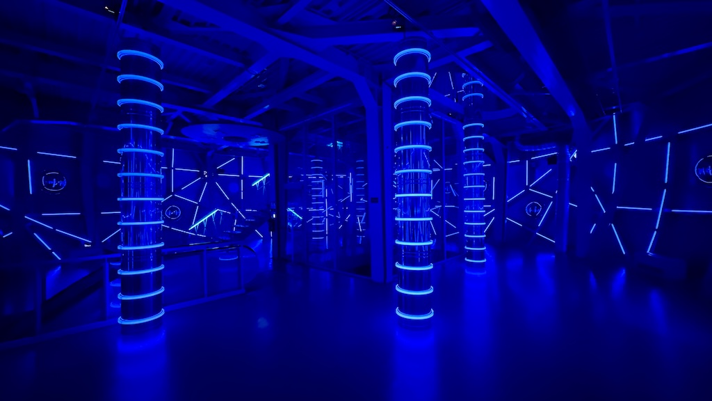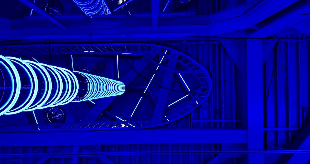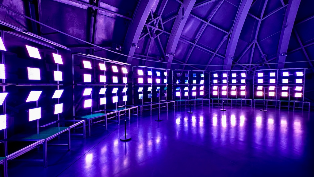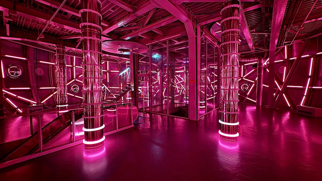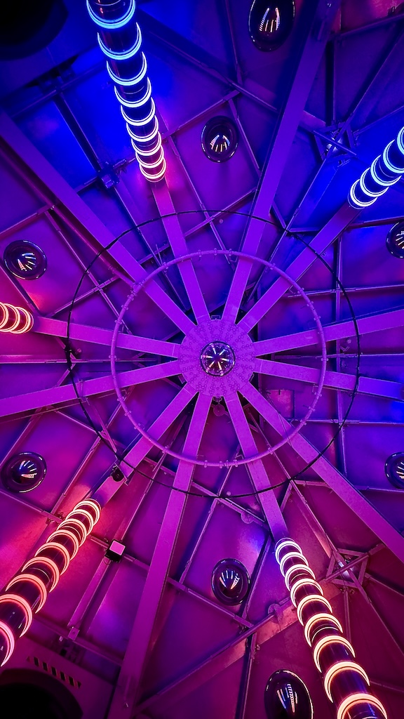 Nimbus by Visual System reshapes the original tubes into luminous columns. Mirrors fracture the geometry visitors think they know. Sound travels through the metal shell. The work is open during the day. Sunlight filters across LEDs and reflective surfaces, creating a softer field of perception. The experience is not dependent on darkness. It is about modulation. You navigate a space that feels suspended yet anchored in steel. Light becomes material rather than effect.