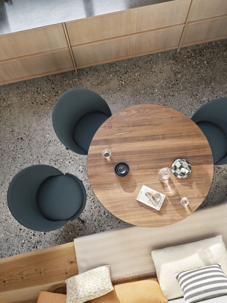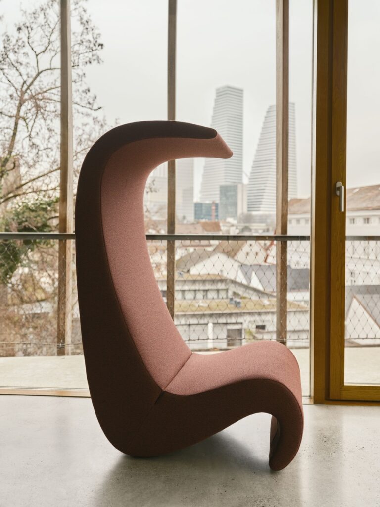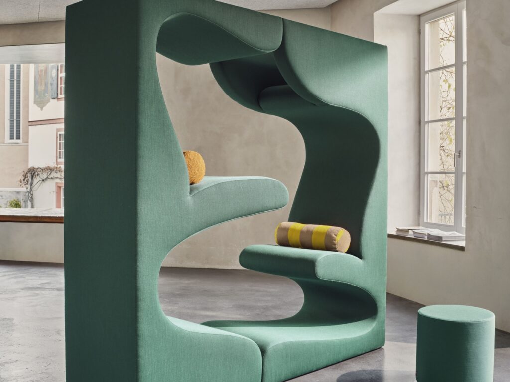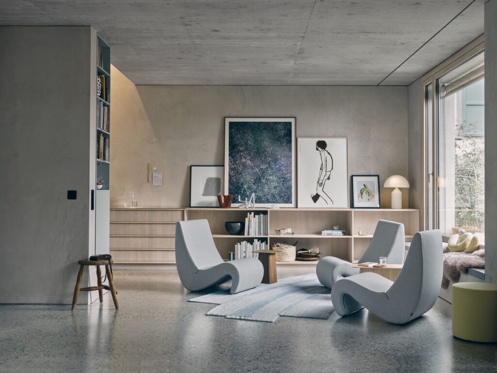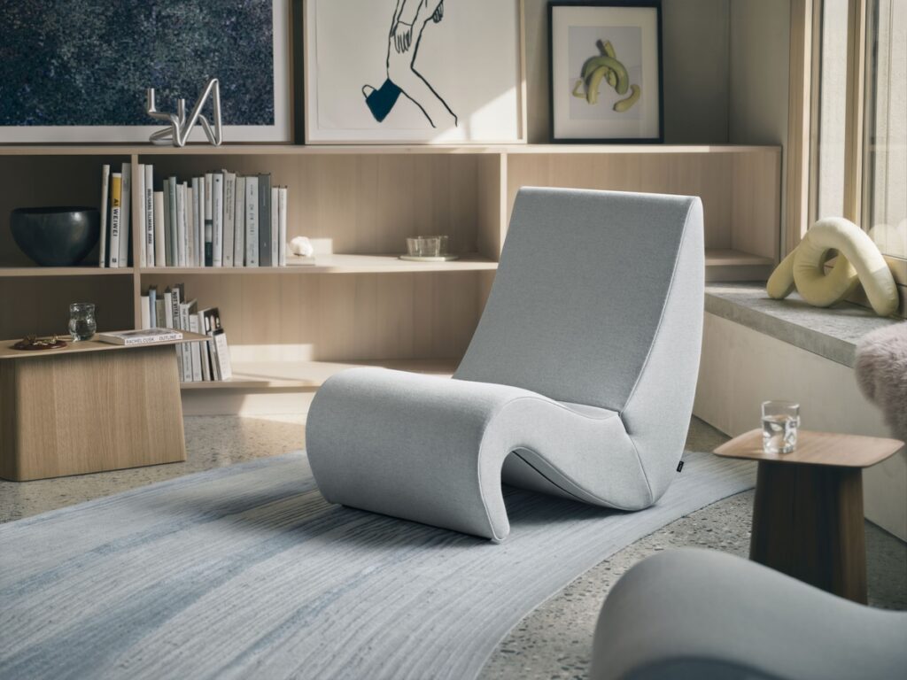 Each piece is defined by how it is used over time. The Amoebe chair brings seat and backrest into a single upholstered form, creating a continuous surface that supports the body in one gesture.