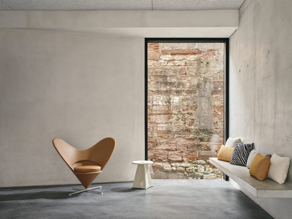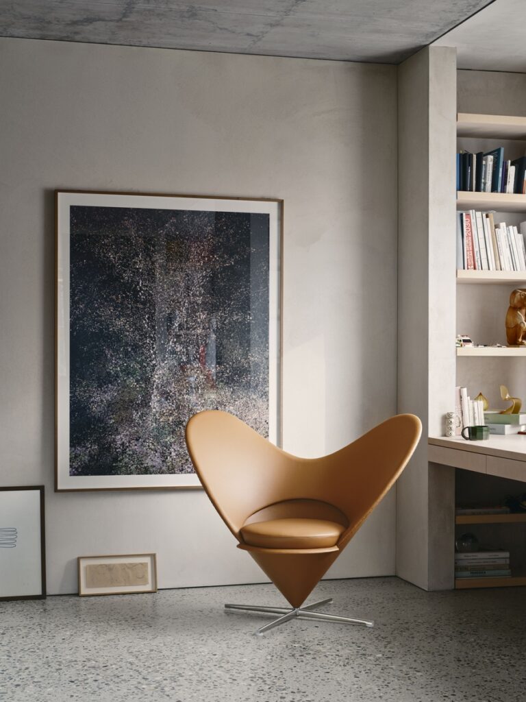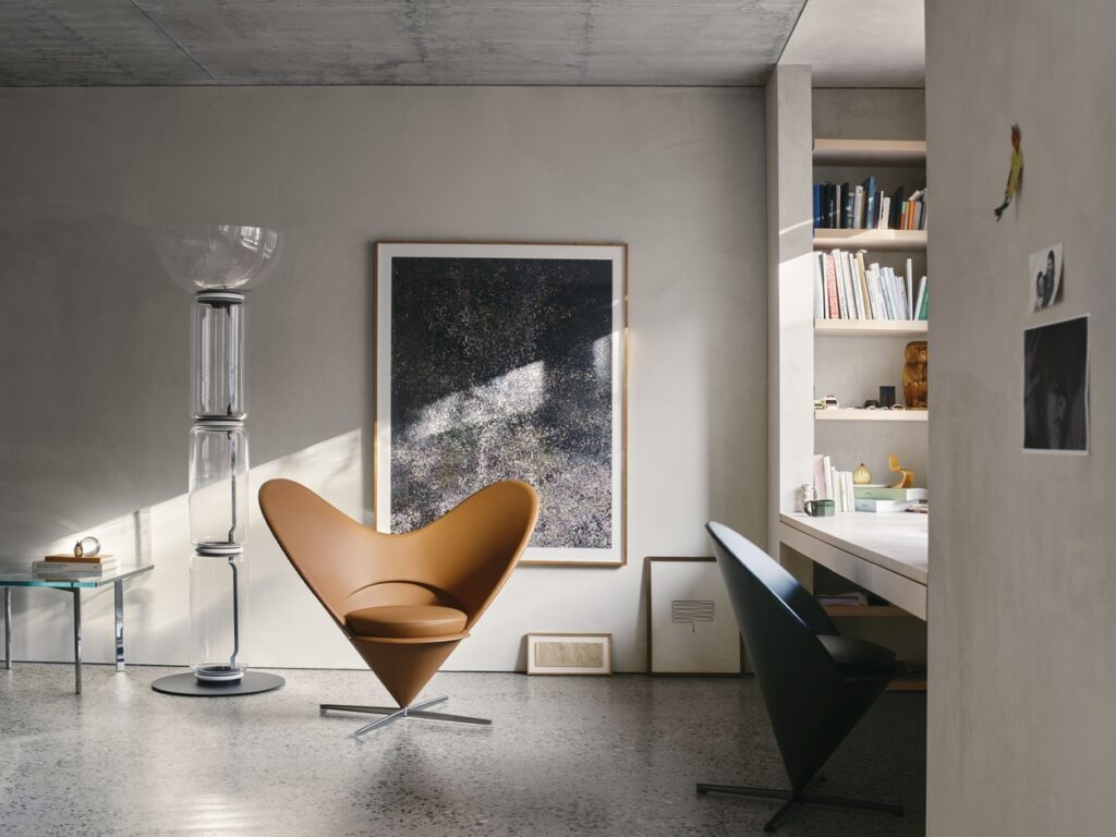 The Cone Chair and Heart Cone Chair continue to be produced using consistent handcrafted methods. The Cone Chair accommodates different sitting positions, with a padded backrest that can also serve as an armrest. The Heart Cone Chair provides generous freedom of movement within its upholstered form. Across both, fabric and leather options determine durability and allow each piece to be integrated into a wide range of environments, including those subject to intensive use.